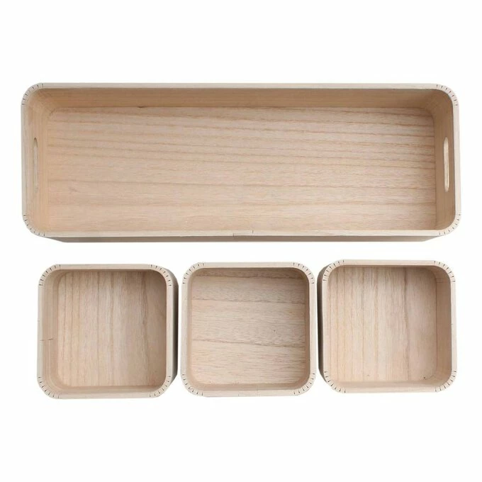 The set includes one long box, with three small square boxes that can be nested within it. The natural wood storage design will be ideal for any room in your home, perfect for storing craft items, small toys, household essentials, stationery and more.