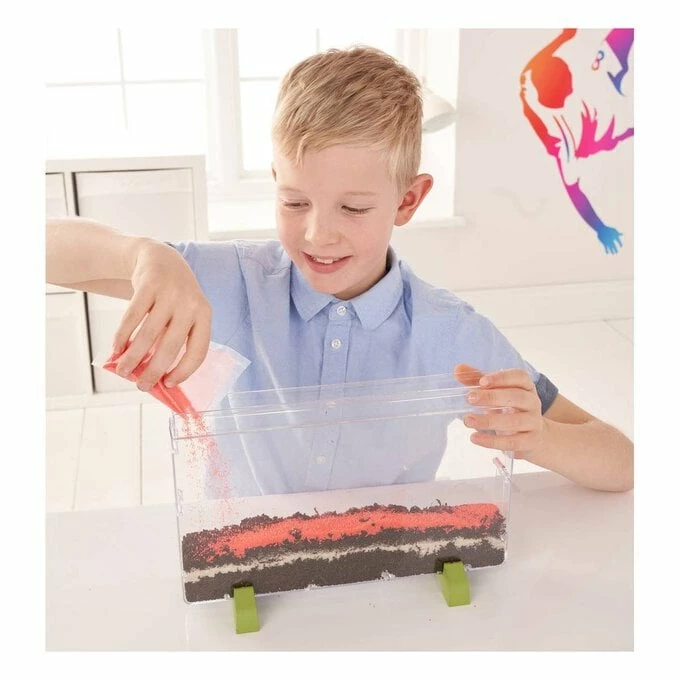 Look inside the fascinating world of worms with this fun and informative kit. Watch your worms mix up the different coloured layers in their chamber and feed them leaves.